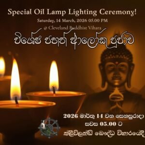 Special Oil Lamp Lighting Ceremony – 2026 Join us for the sacred Oil Lamp Lighting Ceremony – 2026, ... 14 Mar 5:00 PM - 7:00 PM Cleveland Buddhist Vihara and Meditation Center1695 Vernon Odom Blvd, Akron, OH 44320