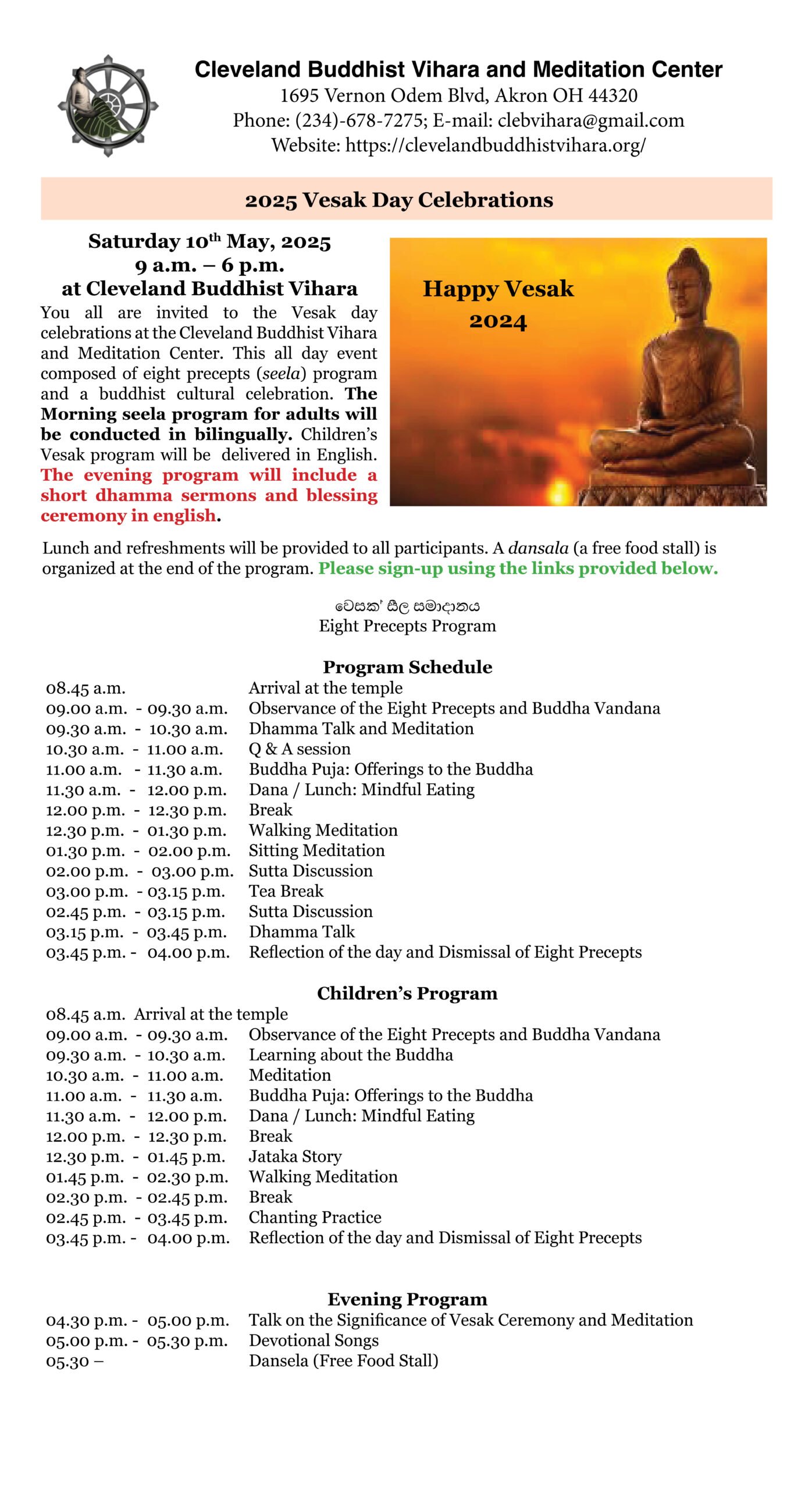 Vesak Celebrations – 2025 + Add to Google Calendar + iCal / Outlook export Date May 10 2025 Expired! Time 9:00 AM - 6:00 PM Local Time Timezone: America/New_York Date: May 10 2025 Time: 9:00 AM - 6:00 PM Location Cleveland Buddhist Vihara and Meditation Center 1695 Vernon Odom Blvd, Akron, OH 44320 Website https://clevelandbuddhistvihara.org Share this event